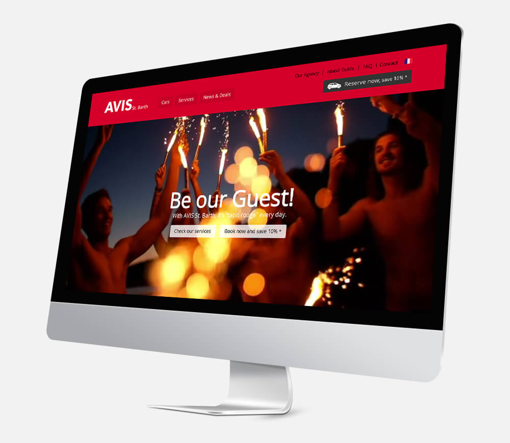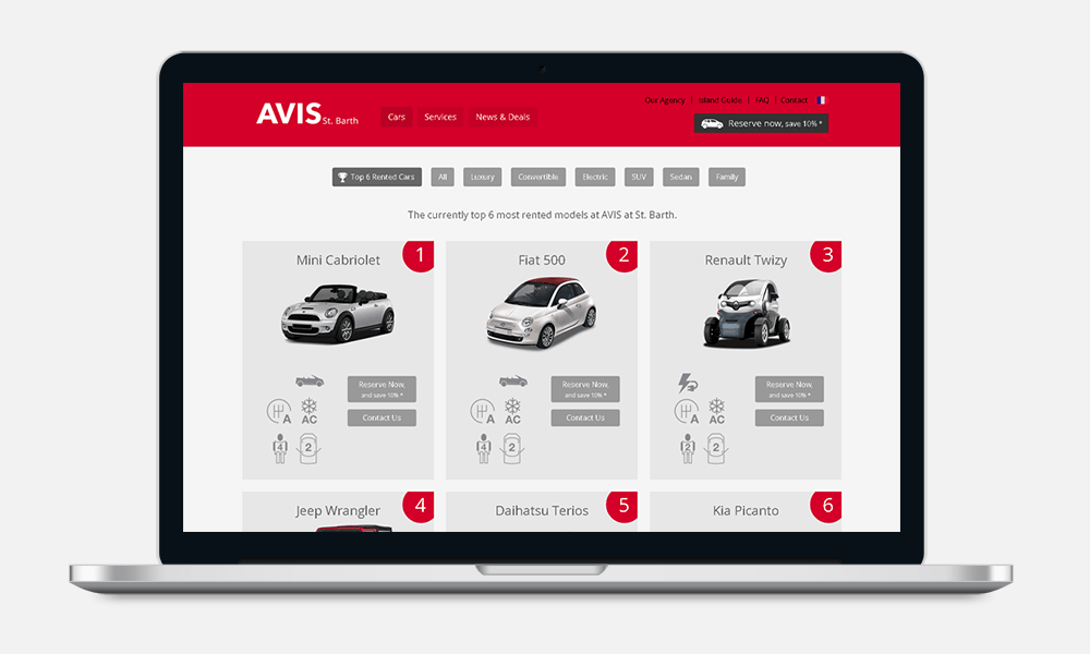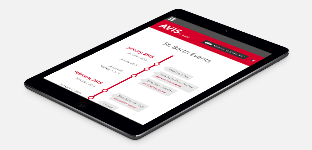 We created a "special" AVIS Web App for a "special" location like St. Barth. Fully responsive and in 2 langages (English and French) the App opens with a full screen video on large monitors. It includes a sortable car directory showing the top 6 rented cars on the island. For credibility and recognition, we stayed close to the official brand style guide.