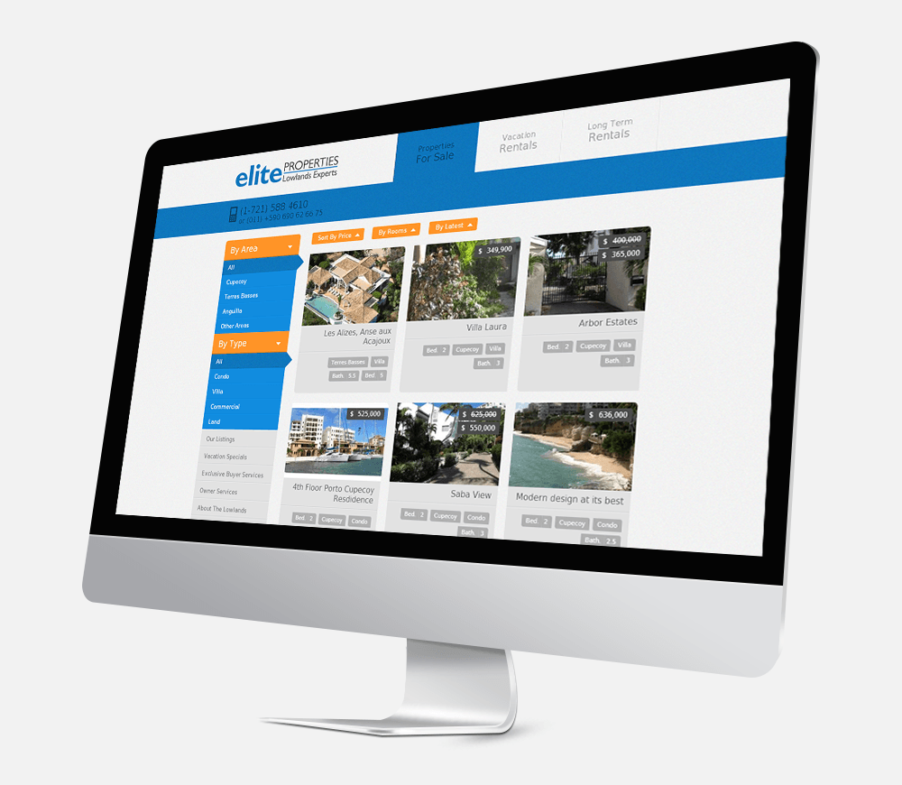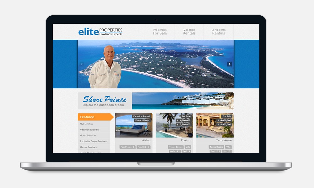 Based on Drupal, the Elite Website includes a sortable dynamic real estate directory. The vacation rental part feeds from an RMS database, located on a different server. Elite's staff can easily add, remove or edit properties from a simplified administration interface.