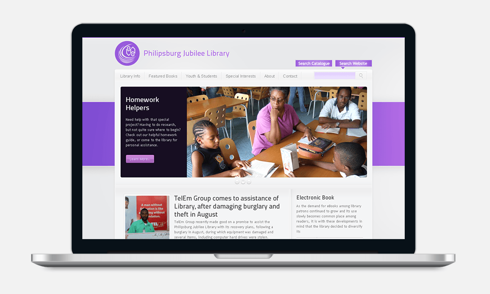 The Library Website was built with Drupal CMS. It features several directories including featured books, homework helpers for students,